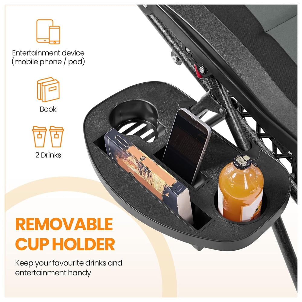 29in Full Padded Zero Gravity Chair Oversized Outdoor Patio Folding Lounger, Adjustable Portable Zero Gravity Recliner with Side Cup Tray, Pillow with Carry Strap for Beach, Pool, Gray/Black