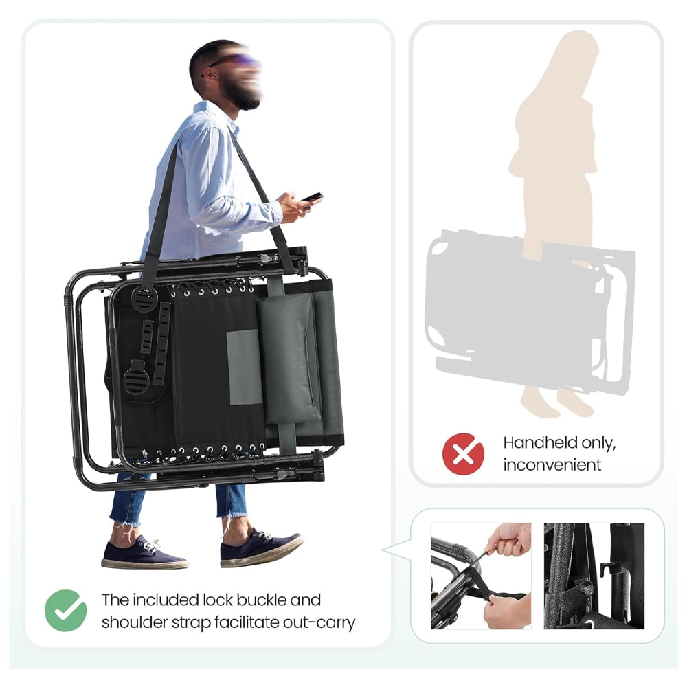 Introducing the 29in Full Padded Zero Gravity Chair, the ultimate outdoor recliner designed to elevate your relaxation experience to new heights. With its oversized dimensions and adjustable features, this portable anti-gravity lounger is perfect for your patio, beach, yard, or lawn. Let's explore the exceptional features that make this chair a must-have for outdoor enthusiasts.Featuring an Adaptive Reclining System, this 29in zero gravity chair allows you to effortlessly find your optimal relaxation position. Adjust the backrest and footrest to your desired angle, and securely lock them in place. The Oxford surface, supported by elastic straps on the metal frame, conforms to your body shape, providing ample support for every part of your body. Feel the stress melt away as you recline in comfort.Designed with your comfort in mind, this adjustable outdoor recliner is perfect for various activities such as fishing, napping, and sunbathing. The cotton-padded extended seat and backrest offer a plush and cozy experience, while the adjustable backrest and footrest allow you to customize your seating position. The secure elastic strap ensures that you remain comfortable and supported throughout your relaxation session.Crafted with a robust construction, the support frame of this zero gravity chair is made of high-hardness and lightweight painted steel. Its triangle structure design provides exceptional stability, capable of holding up to 114 kg/251 lb. Whether you prefer sitting upright or lying down in zero gravity mode, this chair's construction ensures your stability and peace of mind. Relax with confidence, knowing that this chair is built to withstand your needs.Say goodbye to bulky outdoor furniture. This folding outdoor chair is designed with space-saving and high portability in mind. With an overall weight of 8.5 kg/18.8 lb and a folded size of 86.5 L × 73.5 W × 11 cm/34″ L × 29″ W × 4.3″ Thickness, it takes up minimal space and effort to store. Whether it's in your car trunk, garage, or lock room, you can easily find a spot for it. Enjoy the convenience of having your relaxation companion ready to go whenever and wherever you desire.Transporting this outdoor chair is a breeze, thanks to the buckle and strap system. Simply fold the chair and lock the buckle to keep it securely in the folded mode. The included strap allows you to shoulder it out or move it to another location without the need to carry it in your hand.