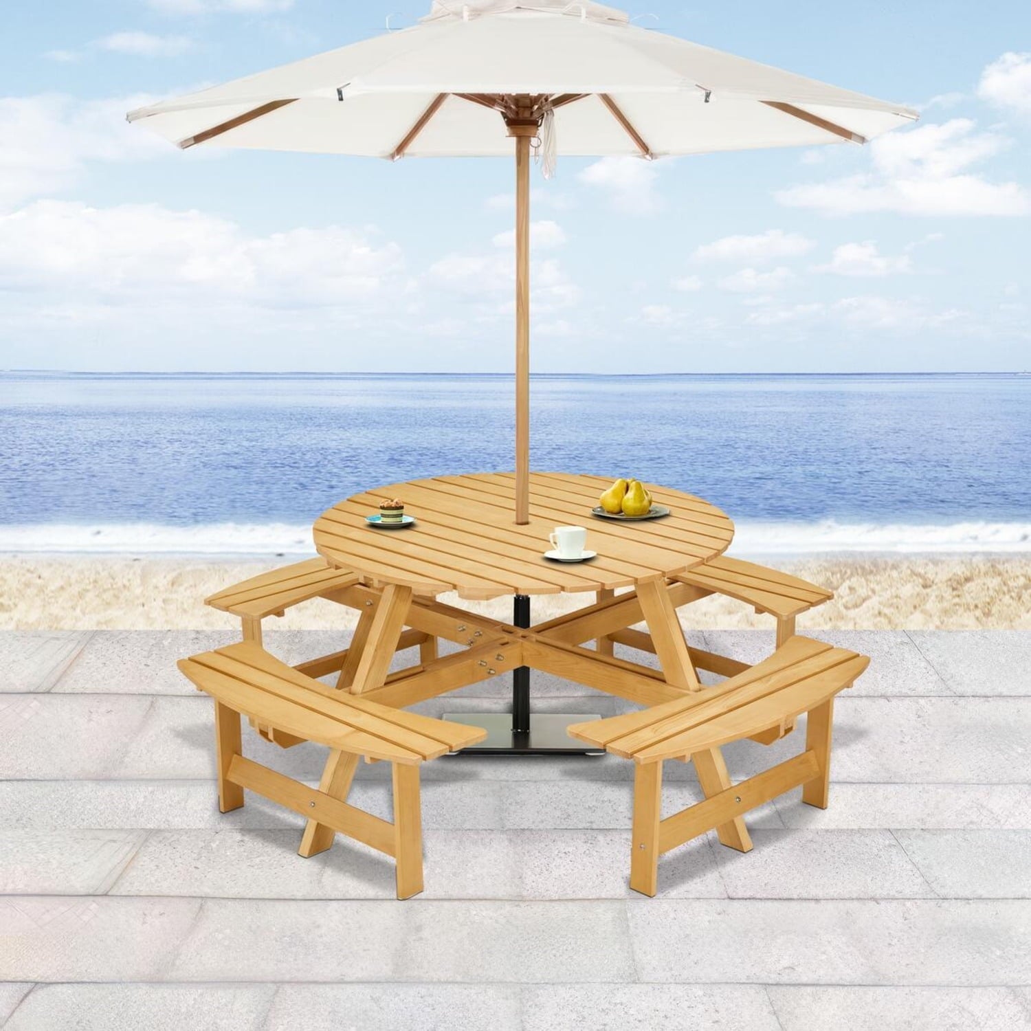 8-person Round Outdoor Picnic Table With 4 Benches & Umbrella Hole, Natural Pine