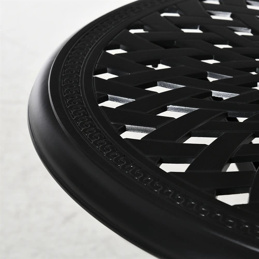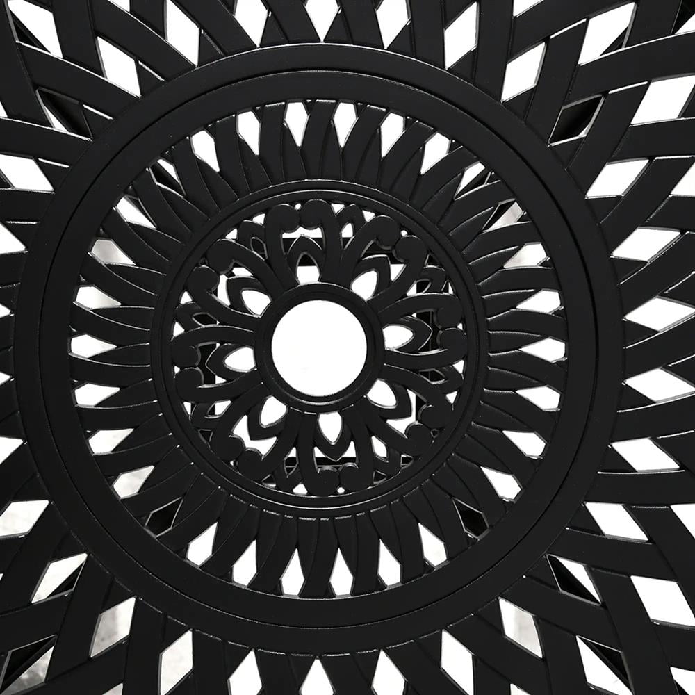 Add classic beauty, style, and grace to your backyard dining with this outdoor table with umbrella hole. Grab a few of our chairs and enjoy sitting outside in the sun while having a place to sit down with your drink or your favorite book. Chit-chat with friends and family and enjoy a meal with this outdoor dining table. Bring more style and functionality to your backyard, patio, or deck with this round outdoor dining table.Features:- Classic metal bistro table completes any setting- Weather-resistant cast aluminum for outdoor use- Center umbrella hole so that you can sit in the shade- Can be coupled with our matching chairs- Table legs with the knob can adjust the height slightly to adapt to the uneven floor- Assembly requiredSpecification:- Color: Black- Material: Cast Aluminum- Table Dimensions: Φ30.75' x 29.25' H- Umbrella Hole: Φ 2'- Weight Capacity: 110 lbs.- Item Label: 84B-729Package Includes:- 1 x Table- 1 x Manual