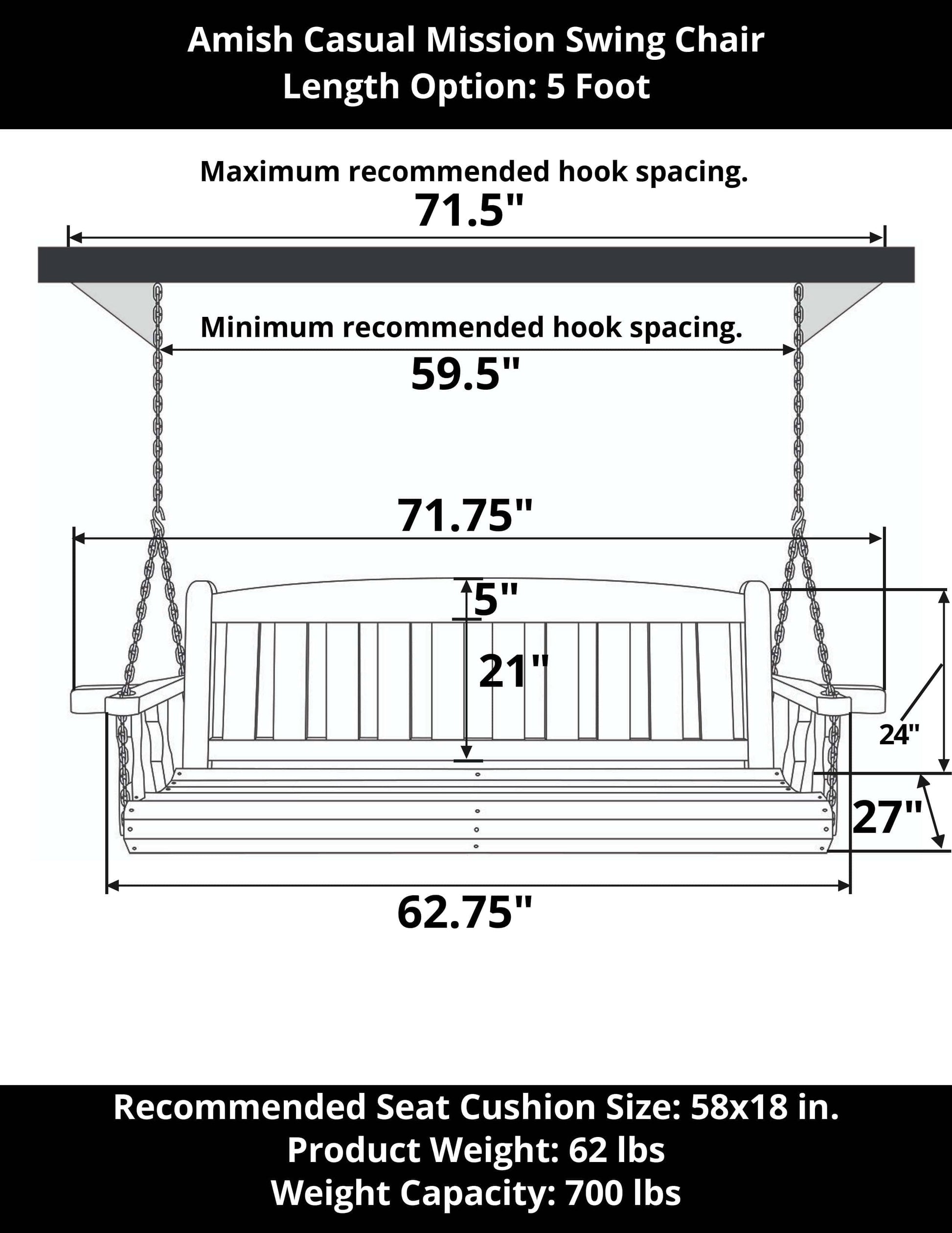 Amish Casual Heavy Duty 800 Lb Mission Treated Porch Swing with Hanging Chains (5 Foot, Semi-Solid White Stain)
