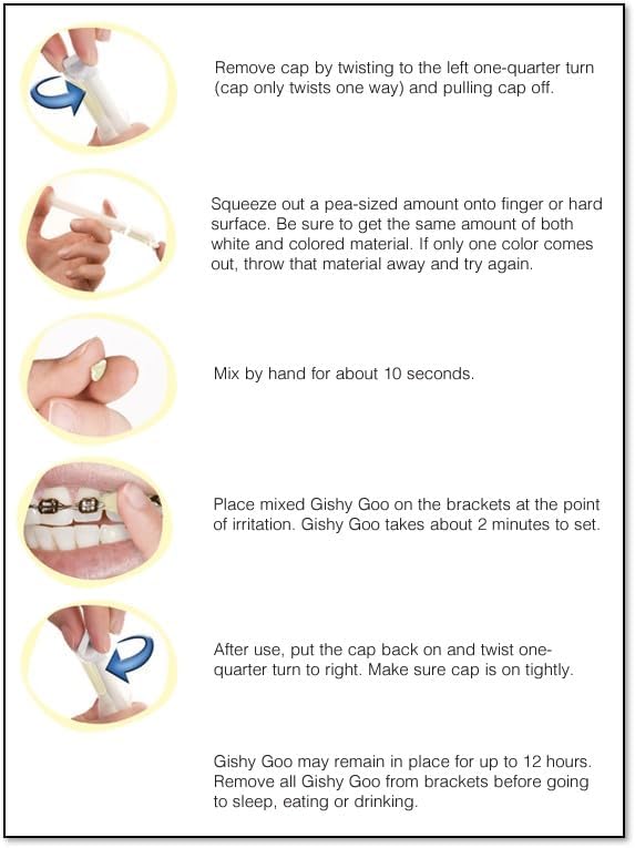 - HASSLE-FREE APPLICATION: No more messing with dental wax for hours on end. With Gishy Goo, it's easier, faster, and mess-free. Simply squeeze a pea-size amount from the syringe, mix it for 10 seconds and place it over the appliance. Talk about a hassle-free pain relief experience!