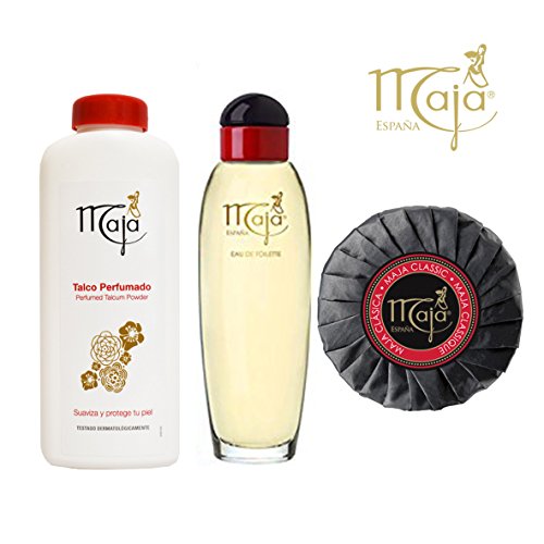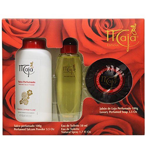- Contains 1.7 ounce eau de toilette spray, 3.5 ounce perfumed talcum powder, 3.5 ounce soap