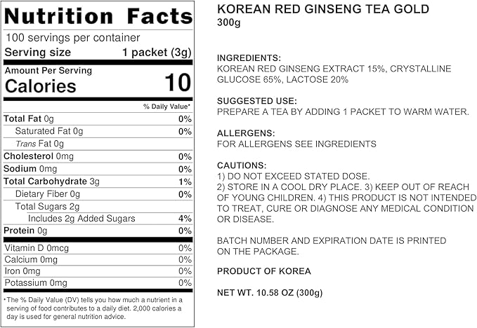 - Ingredient: Korean 6 Years Red Ginseng Extract 15% (Origin Korea, Rg1+Rb1+Rg3=6.7mg/g), crystalline glucose 65%, lactose 20%