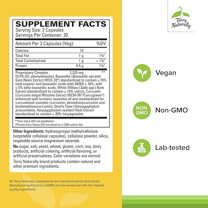 Terry Naturally Curamin Low Back Pain Relief - DLPA & Curcumin Supplement for Relief Support - Enhanced Absorption Curcumin Formula - Herbal Supplement with White Willow & Boswellia - 60 Capsules