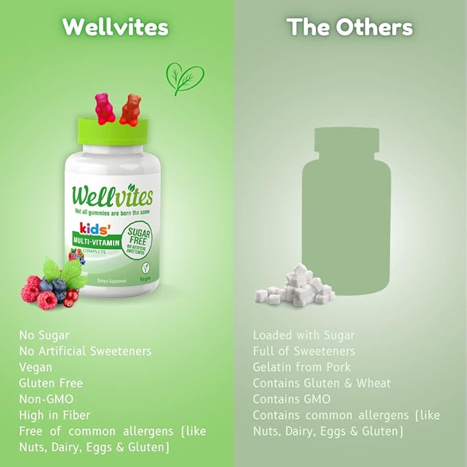 - CHOOSE HEALTHY, CHOOSE WELLVITES: Wellvites is the first gummy vitamin brand to create products with no sugar and 100% vegan ingredients to help you and your kids thrive. We’re confident that you'll love these healthy kids gummies - if you aren’t completely satisfied, we’re happy to give you a full refund.