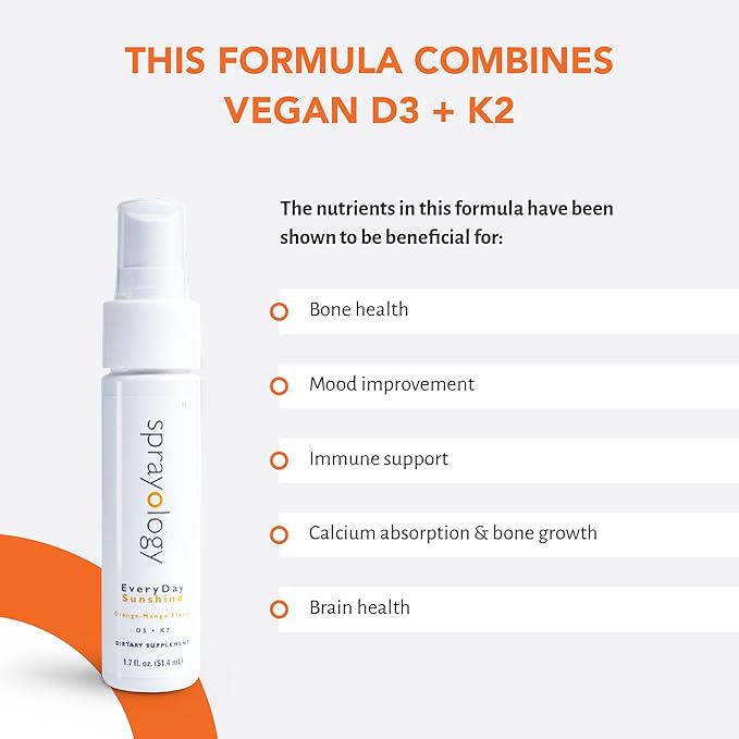- ENHANCED WITH VITAMINS D3 & K2: Sprayology’s Everyday Sunshine combines two essential vitamins to help you strengthen bones and teeth. Vitamin D3 enhances calcium absorption, while Vitamin K2 ensures proper calcium distribution to your bones and teeth with a delicious Orange-Mango Flavor.