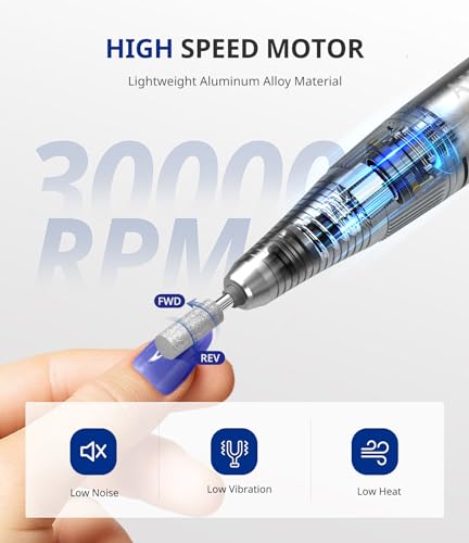 - Expert Versatile: Equipped with 6 metal bits and adjustable 3000-30000 RPM. Low heat, noise, and vibration. Powerful for natural acrylic nails, gel polish, dip powder, cuticle removal, and calluses. Suitable for both home and salon use