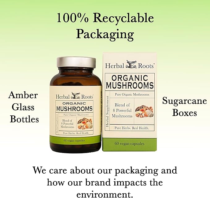 Herbal Roots Mushroom Supplement Capsules | Blend of 8 Organic Mushrooms | Turkey Tail, Lion’s Mane, Shiitake, Cordyceps, Reishi, Chaga, Maitake, Snow | 60 Vegan Capsules
