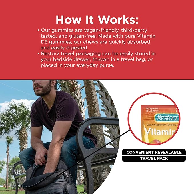 - VITAMIN D3 GUMMIES FOR YOUR HEALTH: Who knew immune support could taste so good? Restorz Vitamin D3 Gummies help support your heart and bones with all natural peach, mango and strawberry flavors. Specially formulated with the best ingredients available.