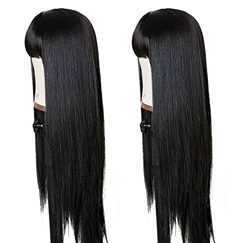 Long Straight Remy Hair Wigs Natural Black Heat Resistant Fiber Hair Full Machine Wig with Bangs Cosplay Party Wig For Fashion Women (24 Inch)
