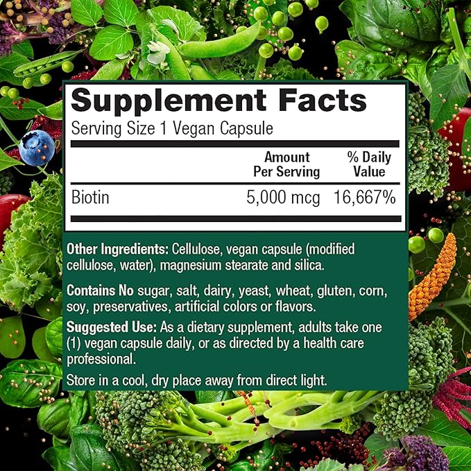 - BIOTIN FOR HAIR SKIN AND NAILS: Biotin is a B vitamin well-known for its role in supporting healthy hair, skin, and nails. Our unique biotin formula provides 16,667% of the Recommended Dietary Intake in one small easy to swallow vegan capsule.