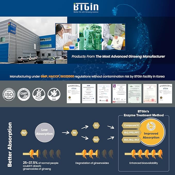 - Efficacy: strong health benefits due to the active ingredient 'Enhanced Ginsenosides” from enzyme processed Korean red ginseng roots by BTGin Bio Technology. This supports immune health, reducing inflammation, antioxidant, and others from Specific Ginsenosides Rg3, Compound K