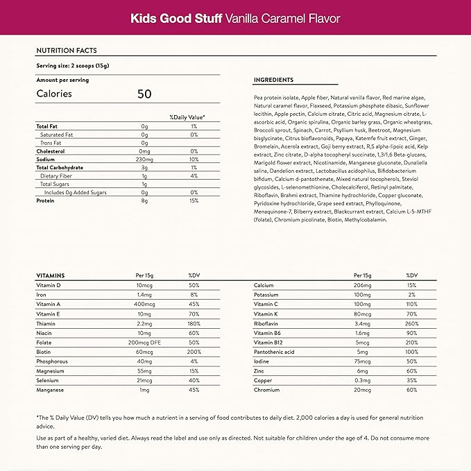 - HEALTHY BONES - Kids Good Stuff has a variety of different fruits and vegetables, 200mg calcium and 8mg of plant-based protein to aid growth and development. Both kids and adults can enjoy this smoothie every day!
