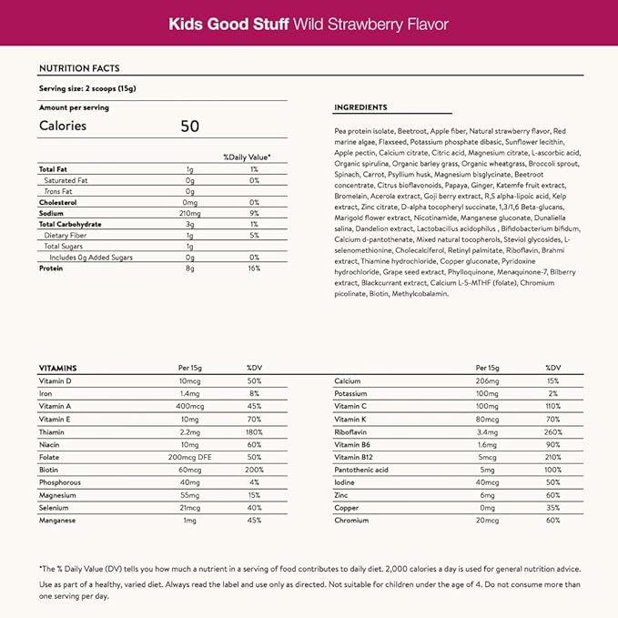 - KIDS SMOOTHIE POWDER - Our wild strawberry vegan smoothie mix is designed for growing kids! Made from a super-blend of protein, greens, fruits and veggies filled with 20 vitamins and minerals supporting kids needs to live, learn, grow and play!