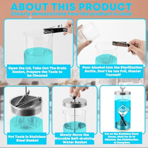 - Usage: The design of the disinfection tank is simple.Users only need to put the tool into the disinfectant,cover it,and complete the disinfection process.Keep hands away from any disinfectant solution.The lid is made of sturdy crystal material,making the knob more comfortable to grip