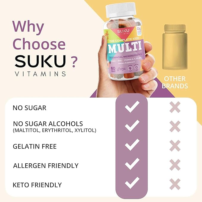 - SUKU Vitamins - The Complete Kids Multi - Vitamin A, Folate, Zinc Gummies for Immunity Support -Easy to Chew- NonGMO, Allergen Gluten Sugar Free - Tropical Bonanza Flavored Gummy Vitamins - 60 Count