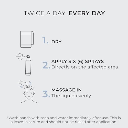 - Easy Spray Application, Twice Daily – Apply 6 sprays to the affected area twice a day. Consistent use may help reduce visible thinning and support hair that looks stronger and denser.