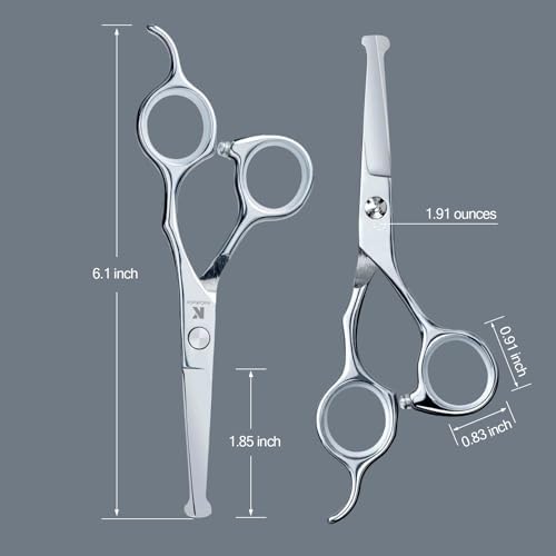 - 🔥ERGONOMIC DESIGN -- Shears for Hair Cutting with curved handle by having a shorter thumb handle allows easy hand movement and pain-free with optimum control. High resilience muffler can reduce cutting noise and anxiety for kids. At a weight of only 1.91 ounces, anyone can use this Hair Trimming Scissors for a long time and won't feel tired. Enjoy stress-free trims with our child-friendly design