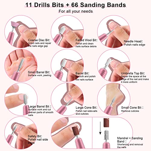 - [11 in 1 Electric Gel Nail Filer Kit] -PELCAS Electric Manicure Nail Drill with 11pcs different nail drill bits and 66pcs sanding bands, which are used for easily grinding, carving, cutting, polishing, removing gel polish and cuticles. High-efficiency rotation provides a continuous and stable operating state, making nail polishing more even, delicate and controllable. Suitable for beginners to do nail art at home.