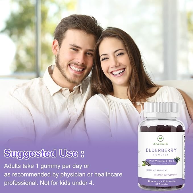 - Bursting with berry flavor, elderberry with zinc and vitamin C to support your immune system, suitable for adults and children 4+. These chewable elderberry gummies are a delicious and convenient way for your whole family to take at home or on the go