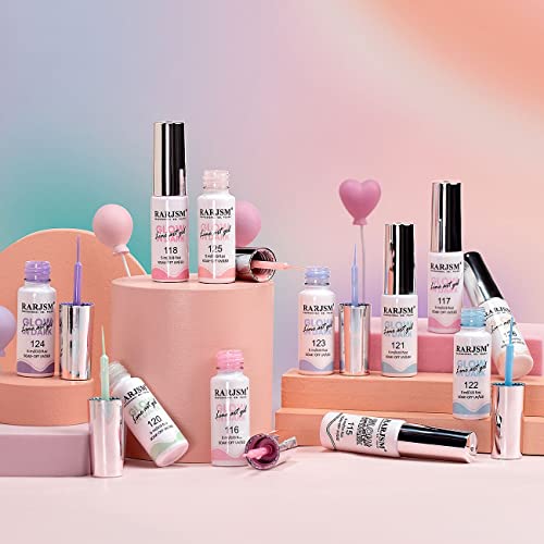 - EASY TO APPLY LONG LASTING:RARJSM soak off nail art gel is made of resin formula and the brush is slim and sharp to draw any pattern.This painted gel nail polish is easy to hand painted,drawing flowers,sumi,pull the line,dotting,striping,etc.These features can help us to get nail art like geometric nails,french manicure nails.With proper application, it can last up to 21days