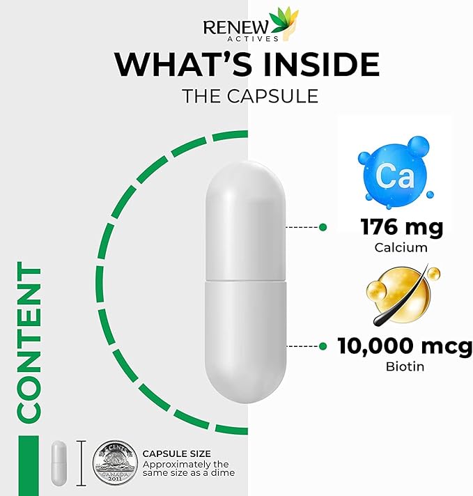 - Strong Bones and Teeth: Renew Actives' Biotin & Calcium 10000mcg Supplements help maintain strong bones and teeth. Formulated to enhance bone density and strength, they contribute to lasting skeletal health and overall well-being