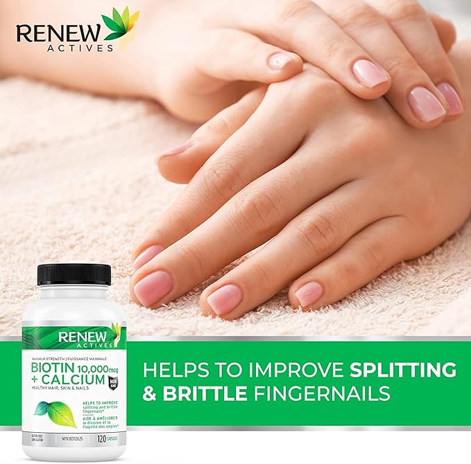Renew Actives Biotin & Calcium 10000MCG per Serving – Supplements for Hair, Nail & Skin Care – Promotes Bone & Teeth Health – Helps Prevent Biotin Deficiency - Made in Canada – 120 Capsules
