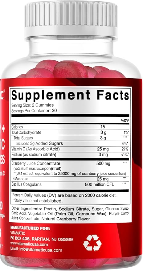 - DELICIOUS NATURAL CRANBERRY TASTE of Vitamatic Cranberry Gummies - Avoid consuming Large Cranberry Capsules, Tablets or Pills which gives unpleasant after taste & can not go down easily