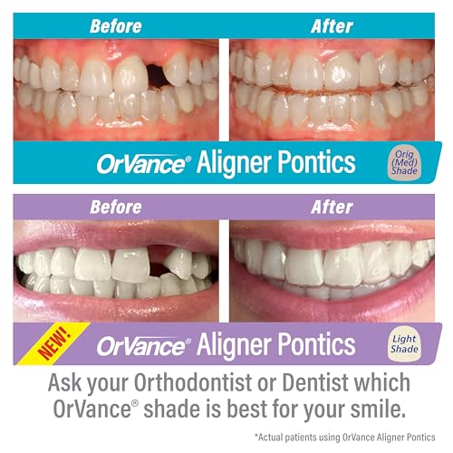 - THE BEST APPEARANCE OF A REAL TOOTH: Aligner Pontics are made of a flexible material that has a very realistic appearance and color of a real tooth so you can continue wearing your Invisalign, clear aligners or retainers confidently. Original (Medium ) Shade Pontics are the ideal shade for MOST people (approximates Vita Shades A2–D2), but for those with extra white teeth, try the New Light Shade. For the surest match, ask your Orthodontist or Dentist which OrVance Aligner Pontics shade is best for your smile.
