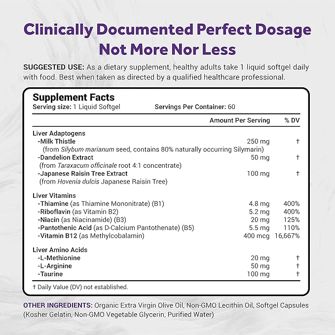- ALL-IN-ONE FORMULA: 1 Liquid softgel per day. All-in-one detoxification formula with liver essential adaptogens, vitamin B complex, and amino acids.