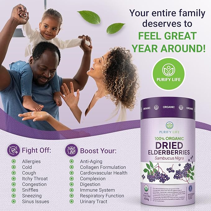 - [Super Antioxidant Immune Support] Elderberries are a powerful immune system supporter, and are higher in flavonoids than blueberries, cranberries, goji berries and blackberries. This is due to chemical compounds called anthocyanidins, which are known to have immuno-stimulant effects on your system. They're also anti-allergic which support sinus congestion symptoms, promotes urination and bowel moments, and has natural diuretic effects.