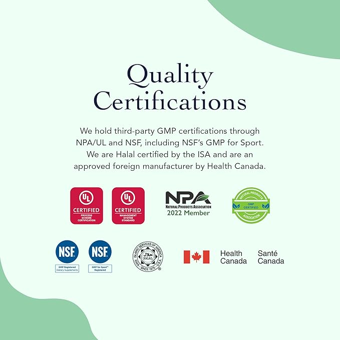 - CERTIFIED FOR QUALITY & PURITY | Trust in our supplements with third-party GMP certifications from NPA/UL and NSF, including NSF’s GMP for Sport. They’re also Halal-certified by the ISA and approved by Health Canada. These internationally recognized inspections ensure the highest standards of purity, potency, and quality.