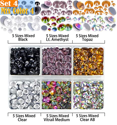 - 4 Boxes of Rhinestone Sets: 10000pcs colored rhinestones in 24 colors, such as rose gold, golden, amethyst, blue, green, hot pink, red, silver ... 1 of tweezers, 2 picking rhinestones pens.