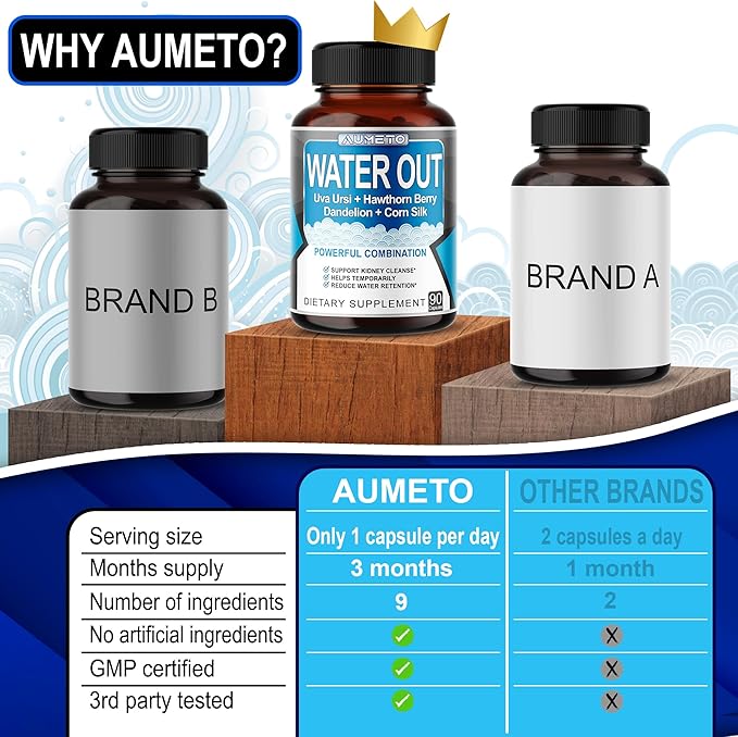 - 1 FORMULA - 9 POWERFUL INGREDIENTS -- Aumeto Water Out Supplement is made with 9 natural ingredients, combined into one capsule.Each serving corresponds to raw powder, making it one of the most concentrated extracts available. One capsule a day is all you need to receive all the necessary benefits.