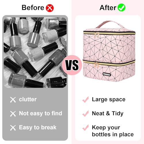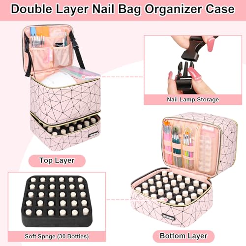 Nail Polish Organizer Bag Holds 30 Bottles (15ml/0.5 fl.oz)& Nail Lamp, Portable Travel Nail Kit Storage Carrying Case, Double Layer Nail Supplies Holder Bag PU Leather Women (Baby Pink)