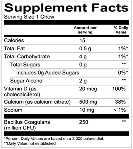 - Each calcium citrate soft chew has 15 calories and no sugar or fat. Each chew has 500 mg of calcium citrate, 800 IU of vitamin D, and 250 million CFU of probiotics.