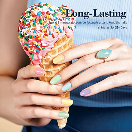 - EASY TO USE AND LONG LASTING:The pastel rainbow gel nail polish set can keep long lasting for 21 days with proper application.The pastel gel polish need base and top coat,and cured under UV for about 60 seconds.It is recommended to apply twice,The nail manicure made in this way not only have high gloss but also are more long lsating