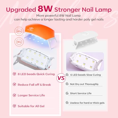 - 【Tips for Nails Last longer】: For better adhesion, ensure proper nail preparation (filing, buffing, and cleaning) to create a slightly rough texture. Apply nail dehydrator and primer. Adjust the nail lamp time according to the thickness of polygel. The 8W nail lamp short press for 60S, long press for 90S. For thicker mani, please cure at least 90s-120s. Ensure seal the edges to prevent water or air from getting underneath