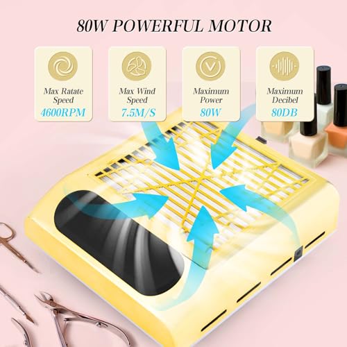 - Nail Dust Collector for Acrylic Nails boasts premium 80W motor with a speed up to 4500 rpms, effectively collect acrylic nail powder and other nail art dust with ease in low noise