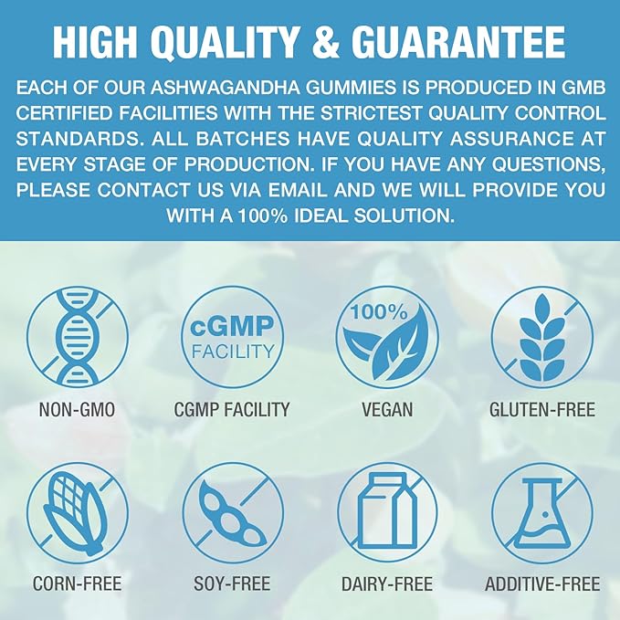 - QUALITY ASSURANCE: Our Premium Ashwagandha gummies undergo rigorous third-party testing to ensure superior quality. Produced in a GMP certified facility. Your satisfaction is our pursuit, if you have any questions or need further assistance, please feel free to contact us via email.
