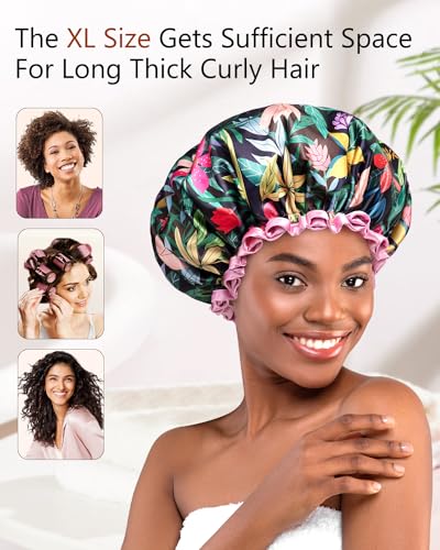 mikimini Rainforest Large Shower Caps Pack of 2, Shower Cap for Women Long Hair with Pink Lace, Reusable Waterproof Shower Hat for Girls