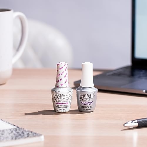 - Gelish Mini Essentials Kit includes two 0.3 fl oz mini bottles: Gelish Foundation Base Coat for adhesion and No Cleanse Top Coat for a glossy, wipe-free finish, providing everything you need for a flawless gel manicure.