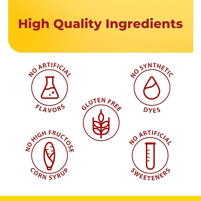 - Delicious daily gummies in strawberry, lemon and orange with other natural flavors; no artificial flavors, no synthetic dyes, no high fructose corn syrup, no artificial sweeteners, gluten free