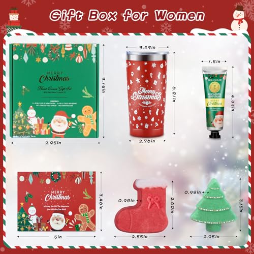 - đ„łăRelaxing Spa Gift Basket for WomenăThe Christmas gift box contains 1 pack 20-ounce stainless steel Christmas insulated tumbler, 4 packs hand creams with different scents - honey, rose, coconut, lavender scent; 1 pack Christmas Tree bath bomb; 1 pack Christmas stocking bath bomb and 1 pcs greeting card. The complete gift set is perfect for women to use during a spa bath or skin care session to relax and unwind.