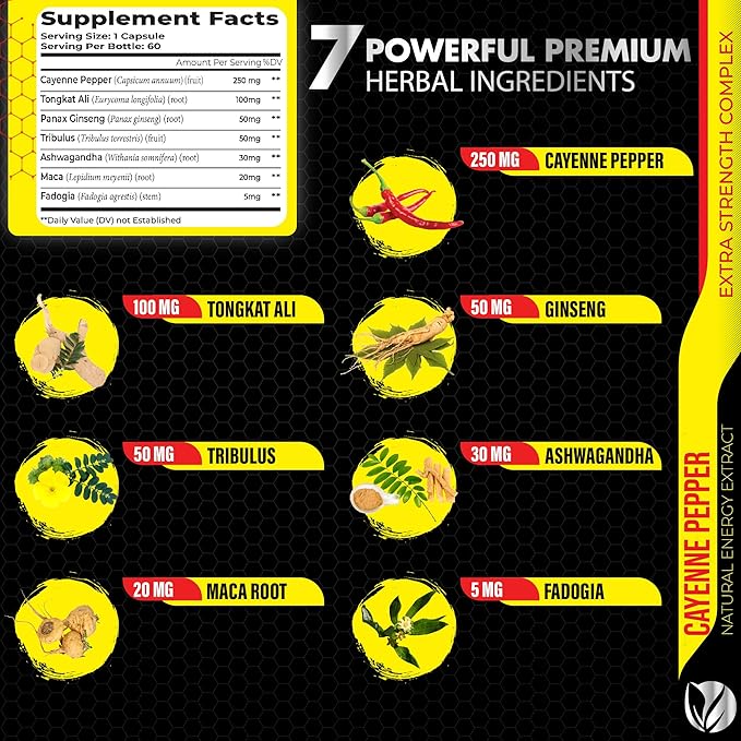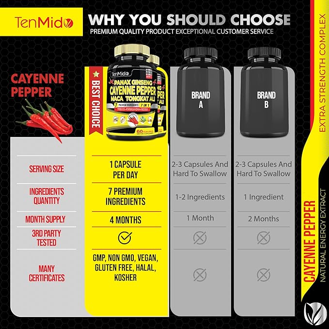 - ❤️ Advanced Formula: Tenmido Cayenne Extract Capsules combination of the highest quality Cayenne powder with 6 extra powerful herbal problematic ingredients: Tongkat Ali, Panax Ginseng, Tribulus, Ashwagandha, Maca and Fadogia. With the special optimized formula, our product has been shown to be one of the most advantageous herbs, highest absorption and bioavailability for your overall health.