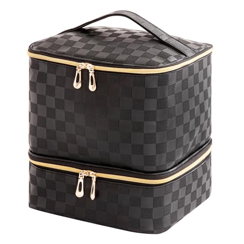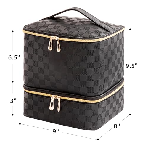 Portable Nail Polish Organizer Bag with UV Light Case - Holds 30 Bottles and 1 UV Nail Lamp, Double-Layers Nail Dryer Case for Gel Nail Polish Kit, Nail Art Decorations(Checkered Black)