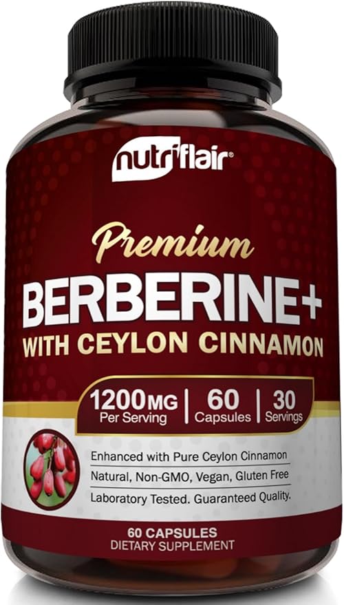 NutriFlair Premium Berberine HCL 1200mg, 60 Capsules - Plus Pure True Ceylon Cinnamon, Berberine HCI Root Supplements Pills - Immune System - yields an Optimal 8% Berberine
