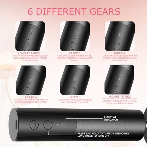 - 【6 Adjustable Speeds】Our Electric Foot File has 6-speed tailored to your usage requirement. Foot callus remover with 6 speed modes are effective for the removal of callus and dead skin, manicure trimming and carving. In addition, our foot sander features an adjustable clockwise and counterclockwise rotation to suit different user preferences and habits.