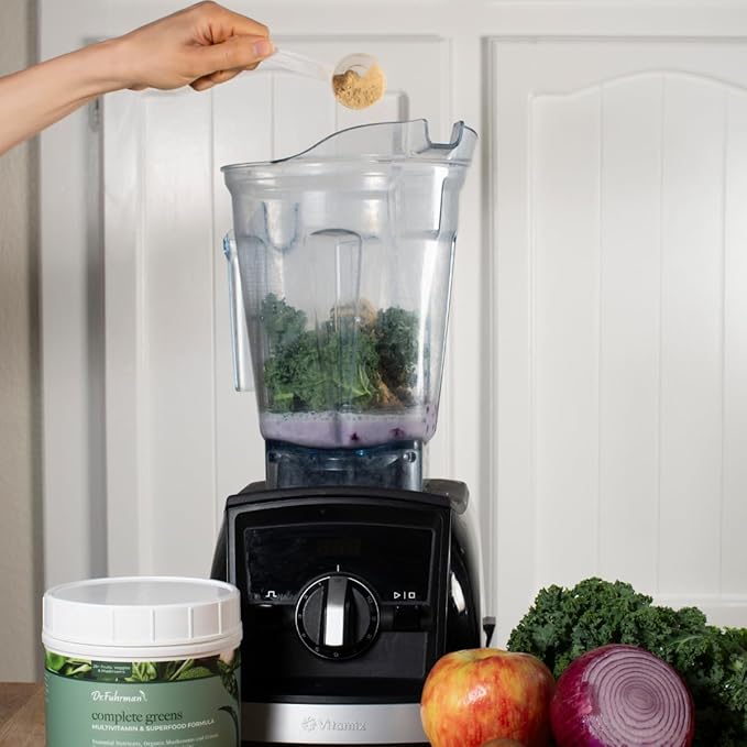 • JUST ONE SCOOP: of Dr. Fuhrman Complete Greens into water or plant milk for an easy and convenient way to get your daily dose of vitamins and nutrient-rich superfoods. Organic fruits and dates give this greens powder a light and sweet taste.